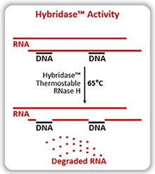 Die Hybridase™ Thermostable RNase H ist eine Endonuclease, die spezifisch RNA in einem DNA:RNA-Hybrid degradiert, ohne andere DNA oder nicht hybridisierte RNA zu verdauen. Im Gegensatz zur E. coli RNase H, die bei 55 °C schnell inaktiviert wird, ist Hybridase RNase H bei hohen Temperaturen noch aktiv.