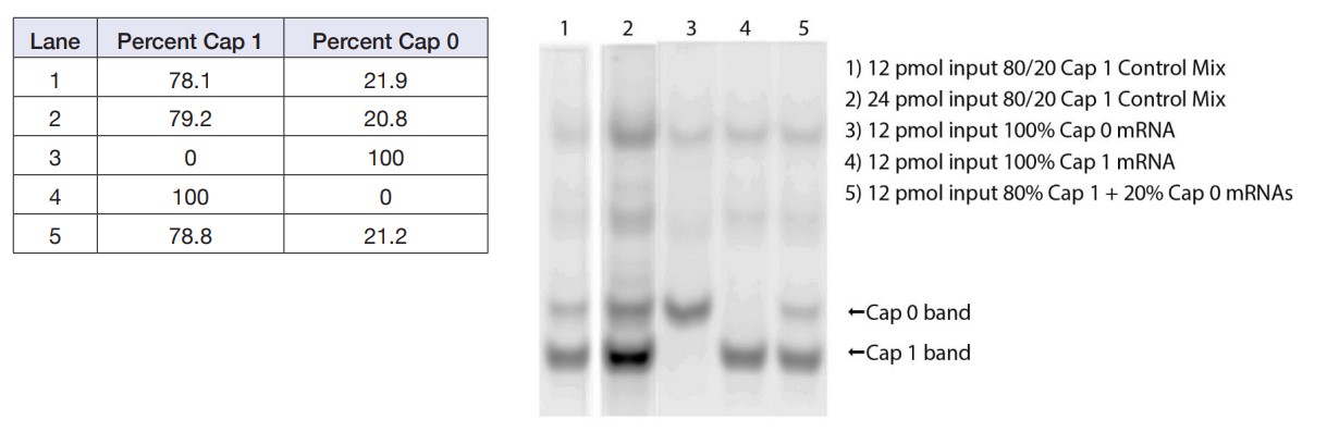 100 % Cap 0, 100 % Cap 1 und eine Mischung aus 80 % Cap 1/20 % Cap 0 mRNA wurden mit dem EZ-QC™ mRNA Cap 1 Efficiency Assay Kit bewertet. Gel-Bildgebungssoftware und der 80/20 Cap 1 Control Mix wurden verwendet, um den Prozentsatz an Cap 0- und Cap 1-mRNA in jeder Spur genau zu quantifizieren.