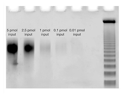 Abbildung 1. Input-Titration des EZ-QC™ mRNA Poly(A) Tail Length Assay Kit. Bereits 0,1 pmol mRNA-Input ist nachweisbar und kann mit der Gelanalysesoftware gemessen werden.