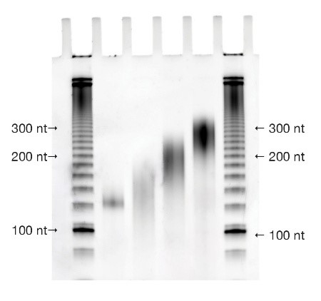 Abbildung 2A: Polyacrylamidgel mit Poly(A)-Tail Längen zwischen 120 nt und 261 nt aus dem EZ-QC™ mRNA Poly(A) Tail Length Assay Kit