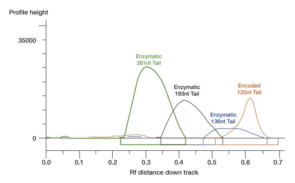 In einem einzigen Lauf kann eine Vielzahl von unterschiedlichen Tail-Längen aufgetrennt werden. Abbildung 2A zeigt die Poly(A)-20-mer-Leiter (Lane 1 und 6), einen kodierten 120-nt-Tail (Lane 2), einen 15-minütigen enzymatischen 136-nt-Tail (Lane 3), einen 30-minütigen enzymatischen 193-nt-Tail (Lane 4) und einen 60-minütigen enzymatischen 261-nt-Tail (Lane 5) in einem einzigen Gellauf. Das Gel zeigt sowohl den Grad der Schwanzbildung als auch die Verteilung des enzymatischen Tailings. Die Länge des Poly(A) Tails zusammen mit Gleichmäßigkeit des Peaks und der Signalintensität helfen optimale enzymatischen Bedingungen zu bestimmen (Abbildung 2B).