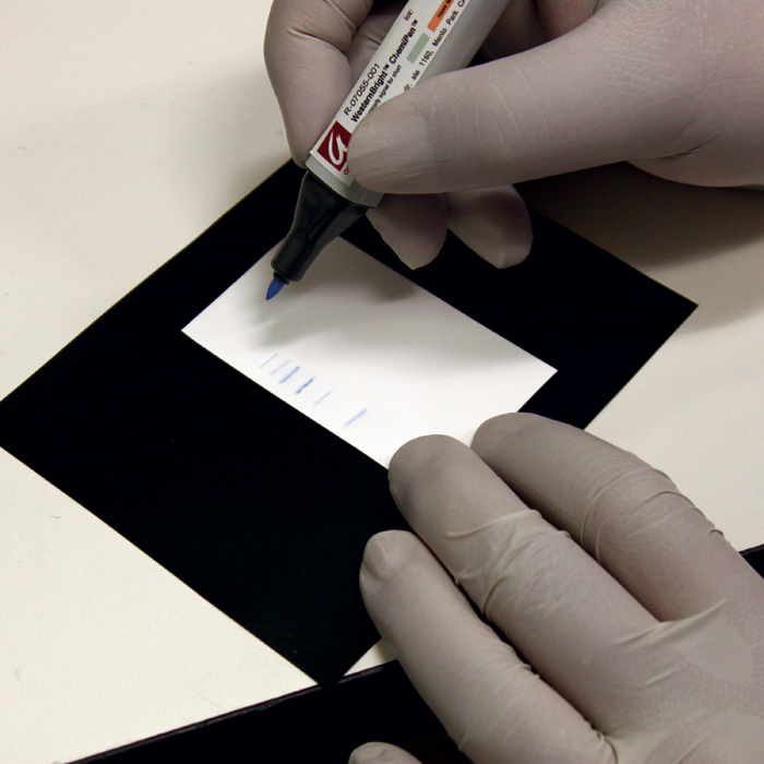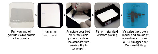 Das Substrat des ChemiPen adsorbiert an Nitrozellulose- und PVDF-Membranen und reagiert mit dem HRP Substrat (z.B. WesternBright Substraten) unter Emission von Chemilumineszenz, die mit Film oder hochwertigem Chemilumineszenz-Systemen detektiert werden kann. Speziell bei Detektion mit Film gibt es keine Möglichkeit den Marker auf dem Chemilumineszenz-Bild zu sehen, es sei denn er ist mit dem Chemilumineszenz Marker Stift markiert.