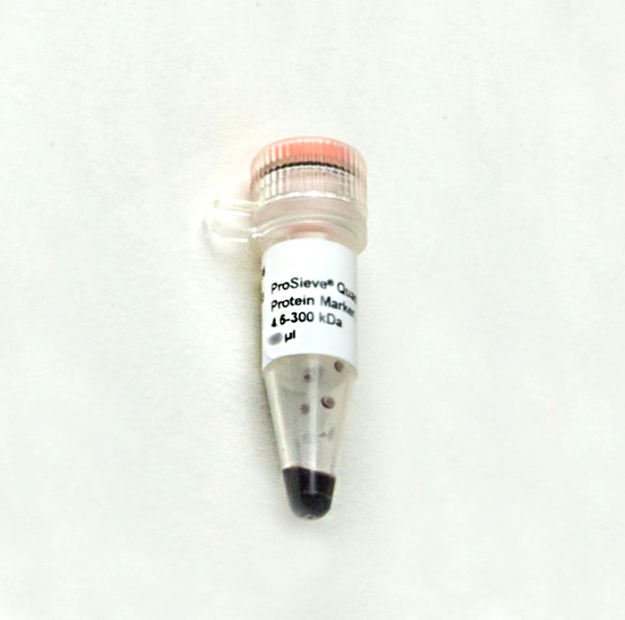 Der ProSieve QuadColor Protein Marker besteht aus einer Mischung von 12 rekombinanten, hochreinen Proteinen mit folgenden Molekulargewichten: 4.6, 10, 15, 25, 40, 55, 70, 100, 140, 170, 250 und 300 kDa. Die Proteine sind individuell mit vier unterschiedlichen Farbstoffen vorgefärbt. Der Marker ist “ready-to-use”, d. h. kein Heizschritt, keine Verdünnung oder Zugabe reduzierender Agenzien nötig.