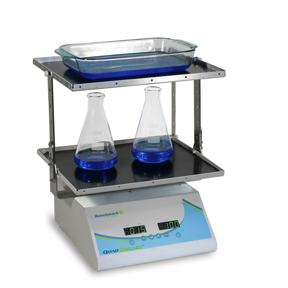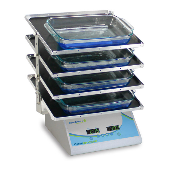 Für die meisten Gel-Blotting-, Wasch- und Färbeanwendungen kann der Rocker mit allen vier Schaukelplattformen installiert werden. Für Anwendungen, die größere Gefäße erfordern, können die Anzahl und Höhe der Plattformen leicht angepasst werden, um einen maximalen Abstand von bis zu 21 cm (8¼ Zoll) zu bieten. Die Vielseitigkeit des QuadRocker wird durch die digitale Geschwindigkeits- und Zeitsteuerung sowie den vom Benutzer einstellbaren Neigungswinkel weiter verbessert.