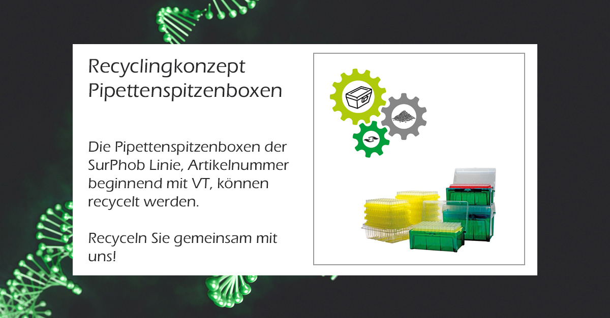 Die Pipettenspitzenboxen der SurPhob Linie, Artikelnummer beginnend mit VT, können recycelt werden.